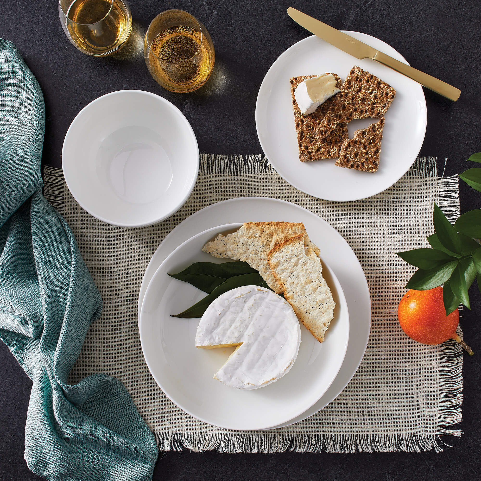 • White-high gloss glaze with embossed texture on rim includes 4 dinner plates, 4 salad plates, 4 soup bowls, and 4 dinner bowls